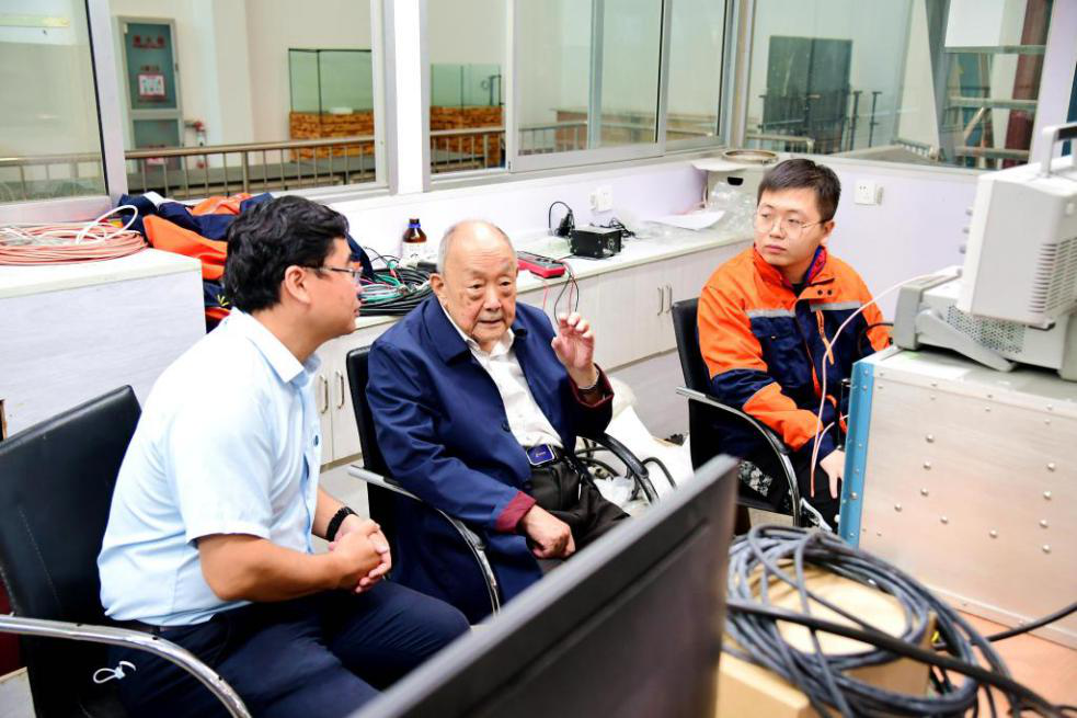 杨士莪(中)为学生讲解水声实验。新华社发(资料照片)